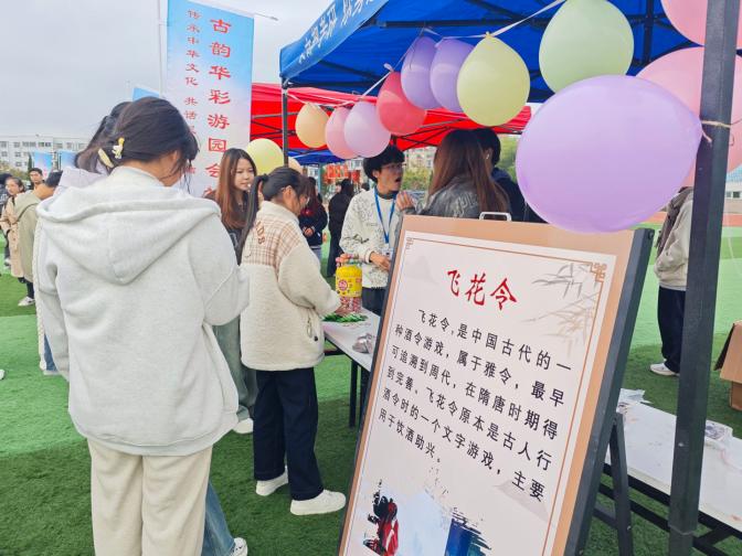 在游园区,有的同学身着汉服,衣袂飘飘,仿佛踏着历史的节拍穿越时空而来,每一笑都映照着古韵的风华,成为现场的一道亮丽风景线。她们不仅展示了传统服饰之美,更让同学们领略到了汉服背后深厚的文化底蕴。这些身着汉服的同学为游园会增添了独特的互动体验,带领大家瞬间入画,沉浸式感受古代文人墨客的雅集盛宴,让人暂别凡尘琐事,仿若坠入了一个时空交错的梦境,置身于充满诗意与雅韵的世界。