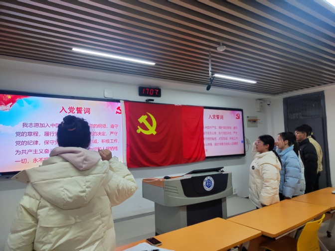在吴金玥的领誓下,全体预备党员整齐列队,面向党旗,举起右拳,目光坚定,誓言铿锵:“我志愿加入中国共产党,拥护党的纲领,遵守党的章程,履行党员义务,执行党的决定,严守党的纪律,保守党的秘密,对党忠诚,积极工作,为共产主义奋斗终生,随时准备为党和人民牺牲一切,永不叛党。”入党誓词是他们对党的庄严承诺,表达了他们对共产主义信仰的执着坚守和为人民服务的坚定决心。