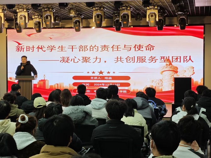 第三个环节中,学院党委书记哈焱围绕“新时代学生干部的责任与使命——凝心聚力,共创服务型团队”这一主题展开深入讲解。他结合丰富的实例,阐述了服务型团队在学院学生工作中的重要性。他指出,学生干部应秉持服务同学的理念,积极倾听同学们的需求,通过高效的沟通与协作,提升团队整体的服务效能。在团队组建方面,哈焱详细介绍了成员角色定位、优势互补等要点,强调要充分发挥每个成员的潜力,以实现团队目标。学生干部是学生身边的表率模范,是老师的的得力助手,是师生联系的桥梁。学生工作是学生干部自我成长的平台,是服务学生的阵地。希望广大学生干部珍惜自我成长的机会,善于总结和思考,以更高标准要求自己,树立服务学生成长成才的宗旨。