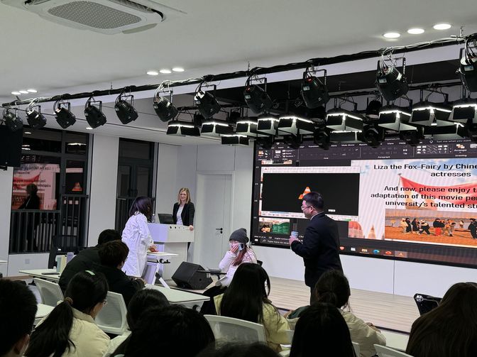 本次活动以电影为纽带,编织起跨文化交流的绚丽锦缎,主要包括“匈牙利电影发展史简介”“经典电影片段赏析”和“角色扮演”三个主要版块。活动伊始,主讲人Alice首先带领同学们回顾了匈牙利电影业的历程,从早期具有开创性意义的影片,到在国际各大电影节崭露头角的当代佳作,详细阐述了匈牙利电影独特的艺术风格与创新精神。随着讲解的深入,影片《Liza - The Fairy-Fox》片段成为了全场焦点。这部影片不仅是匈牙利电影中的杰出之作,展现出东欧文化独特的艺术魅力。观众可以看到匈牙利城镇的美丽景象,感受到那里的风土人情。从每一座房屋的建筑风格,到城镇里弥漫的生活气息,无不体现出匈牙利文化的深厚底蕴。同时,影片中的角色遵循的民俗礼仪不仅丰富了影片的内涵,也让观众更加深入地了解了匈牙利的传统习俗。同学们纷纷表示,通过展示,他们看到了匈牙利文化与其他文化的共通与差异之处,这种跨文化的交流与碰撞让每位同学对世界文化多样性有了更深的认识。