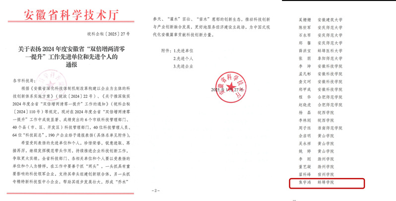 近日,安徽省科技厅对2024年度全省“双倍增两清零一提升”工作中成效显著、成绩突出的集体和个人进行了表彰,我校电子与电气工程学院院长王艳春教授,材料与化学工程学院副教授焦宇鸿获得“先进个人”荣誉称号,这是蚌埠学院坚持“地方性、应用型、数智化”办学定位,落实《安徽省深化科技体制机制改革构建以企业为主体的科技创新体系实施方案》,积极服务地方经济发展的生动实践。