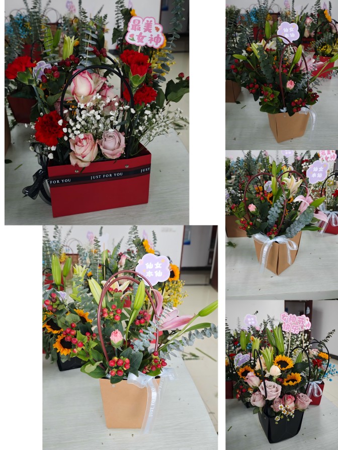 为了让老师们更好的了解插花艺术和活动流程,工会提前准备了学习视频,让老师们对于花材选择、色彩搭配和插花技巧有了基本的认识。活动现场花香四溢,老师们仔细的挑选鲜花,修剪枝叶,将玫瑰、百合、康乃馨、洋甘菊等花材巧妙组合,构思布局,创作出专属自己的插花作品。活动现场欢声笑语不断,大家在相互交流中拉近距离,美丽的花束传递了美好和祝福。