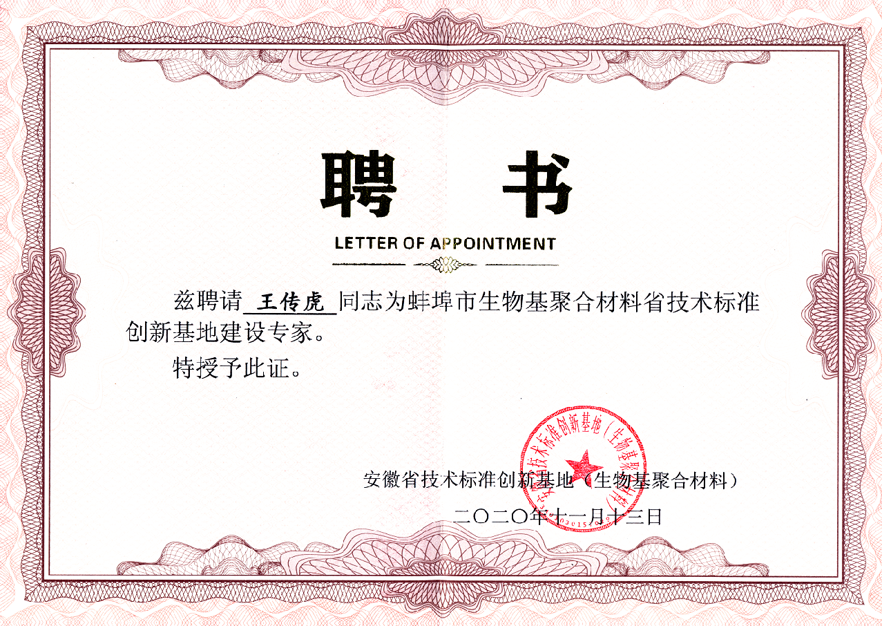 作为化工与材料领域的专家,王传虎教授多年来积极投身于产学合作,深度融入地方经济建设。在政府合作层面,他凭借扎实的专业知识和丰富经验,担任了蚌埠市硅酸盐材料协会理事、蚌埠市人民政府重大决策咨询论证专家、蚌埠市生物基材料专家委员会秘书长、蚌埠市生物基材料标准化专家、蚌埠市应急局安全生产专家、蚌埠市市场局质量技术帮扶专家库专家等多项职务,为蚌埠的发展建言献策。主持完成蚌埠市科技计划项目,市级重点智库课题,成果获评优秀。作为首批双链融合专员,他利用专业特长助力企业创新链与产业链融合,在产品质量安全监管工作中成绩斐然,获市场监督管理局表彰。