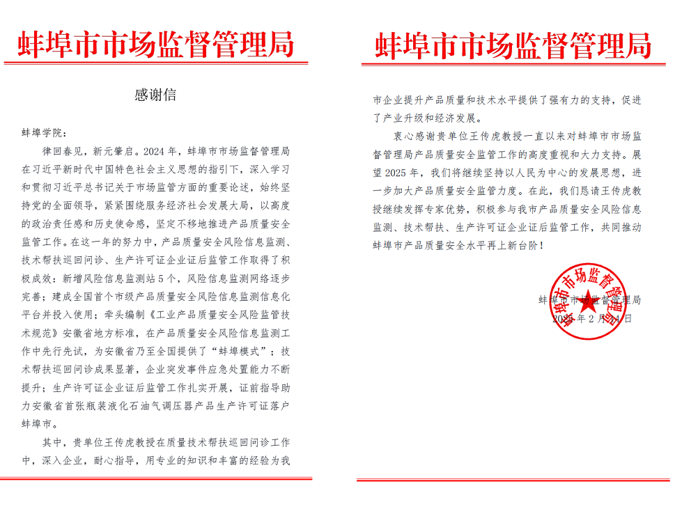 近日,蚌埠市市场监督管理局向我校发来感谢信,对材料与化学工程学院王传虎教授,在蚌埠市市场监督管理局产品质量安全监管工作中,特别是在质量技术帮扶巡回问诊工作中,深入企业,耐心指导,为企业提升产品质量和技术水平提供了强有力的支持,促进了地方产业升级和经济发展,表示衷心的感谢。这是蚌埠市对我校教师服务蚌埠地方经济发展做出贡献的充分肯定。