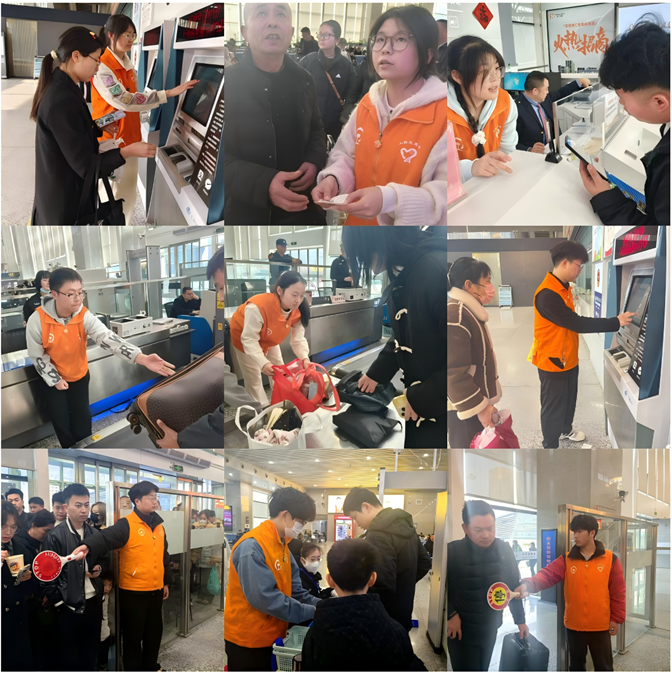校园外,志愿者们身着醒目的橙色马甲,来到蚌埠高铁南站,积极投入到志愿服务中。他们协助旅客在自助购票机取票购票,引导旅客有序进出车站,帮助携带重物的旅客搬运大件行李。在扶老携幼、答疑解惑的过程中,他们用自己的热情和耐心温暖了每一位旅客的心。志愿者们始终坚守岗位,尽职尽责,用他们的青春热度为蚌埠南站增添了无尽的温暖与活力。