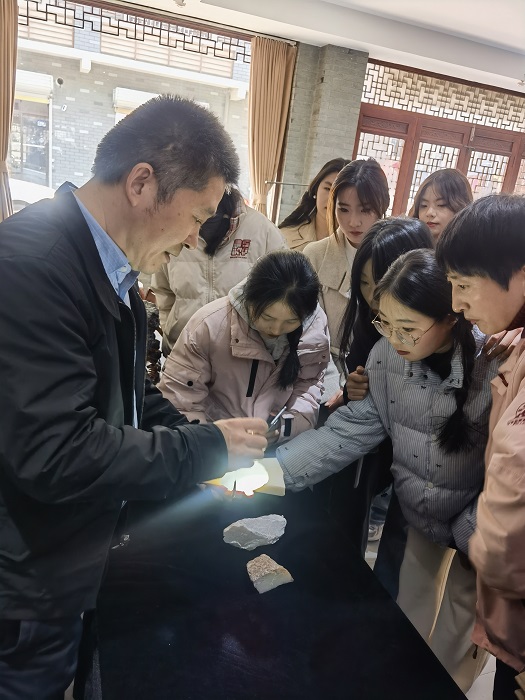 玉石之美,产业之兴——淮河文化的璀璨明珠。参观过程中,蚌埠玉石学会会长、安徽省政协委员李家喜为同学们现场展示了各类玉石,并详细讲解了蚌埠玉石产业的发展历程和现状。从温润细腻的和田玉到晶莹剔透的翡翠,同学们不仅对玉石的种类、质地和鉴别方法有了更深入的了解,也对蚌埠作为“中国玉器之乡”的产业优势和文化底蕴有了更深刻的认识。