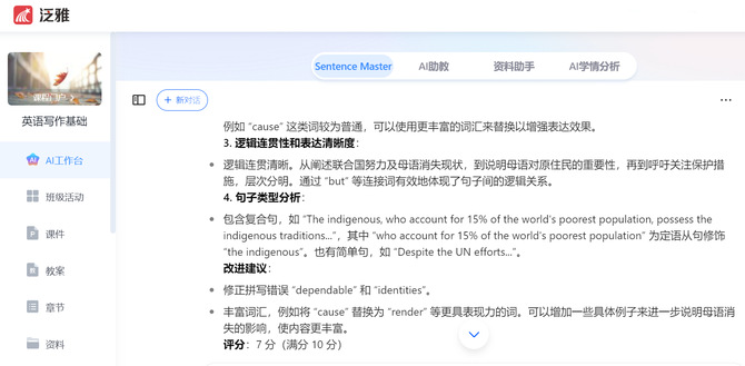 在智能评分与反馈环节,学生完成写作任务后,AI智能体即时对习作进行评分,从语法、句子结构到修辞效果提供详细反馈,帮助学生快速发现问题并优化表达。