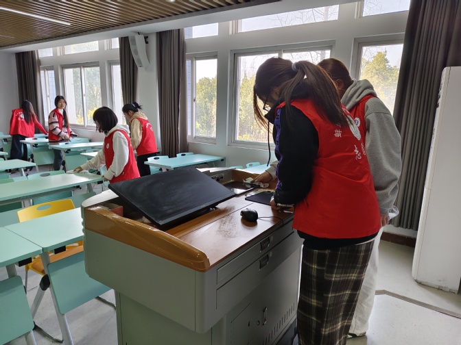 活动伊始,同学们身穿红色马甲,手持扫帚、抹布等工具早早在教学楼集合,经过简单分组后迅速有序开展清扫工作,对校园内B楼所有教室的地面、桌椅、门窗、黑板及卫生死角开展“地毯式”清理。同学们充分发挥“不怕苦,不怕脏,不怕累”精神,以实际行动践行雷锋精神。经过同学们的努力,校园环境焕然一新。同学们纷纷表示,通过这次活动,深刻体会到了雷锋精神的意义,今后会更加珍惜校园环境,积极参与志愿服务。