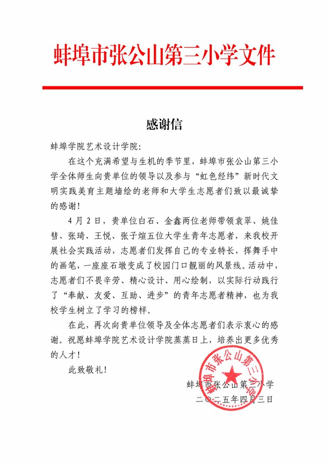 活动结束后,张公山第三小学向艺术设计学院青年志愿者协会发来感谢信,对志愿者们的辛勤付出表示衷心感谢,并称赞此次活动为校园文化建设注入了新活力,为孩子们带来了美的熏陶和思想启迪。未来,艺术设计学院团委将继续深化“虹色经纬”志愿服务品牌建设,以美育为纽带,以志愿服务为桥梁,引导广大青年学子在实践中坚定理想信念,厚植家国情怀,为新时代文明实践贡献更多青春智慧与力量。(撰稿:金鑫;编辑:李俊锦、毛星懿;审核:高善春、黄灿)