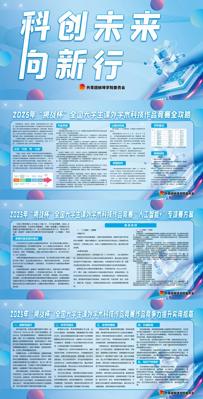 为深化创新创业教育,激发学生学术科研热情,由蚌埠学院校团委主办的2025年“挑战杯”大学生课外学术科技作品竞赛自2024年10月启动以来,历经半年精心培育,于4月12日在5G双创中心多功能厅圆满落幕。本届赛事通过“三级进阶”培养体系,构建起“校内初筛-校外盲审-专项训练营-终极展示”的赛事链条,全校13个学院千余名学子参与,累计申报项目161项。