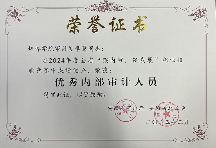 日前,安徽省审计厅、安徽省总工会联合发文通报了2024年全省“强内审,促发展”职业技能竞赛结果,我校审计处李慧同志凭借出色表现,荣获“优秀内部审计人员”荣誉称号。