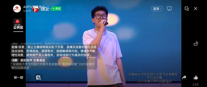 5月9日,由共青团安徽省委、安徽广播电视台、安徽省学生联合会联合主办的安徽省大学生校园十大歌手走进基层系列暨“2025 安徽百事校园最强音”系列活动第五站在蚌埠学院学术报告厅精彩上演。本次活动通过安徽文体综艺频道全程直播,现场及线上累计吸引约 2.18 万名观众观看。