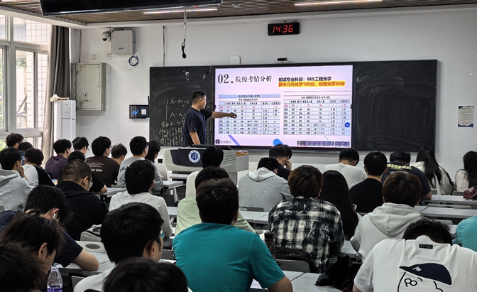 5月14日下午2:30,数理学院光电工程专业在B109教室举办考研经验交流会,特邀2021级四位考研成功的同学为低年级同学分享经验,内容涵盖择校策略、科目备考、复试准备及调剂技巧,吸引百余名学生参与。