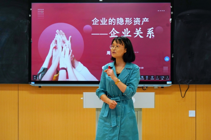 创新创业全国优秀教师、蚌埠市刘美玲创业指导大师工作室领衔人刘美玲老师以《企业的隐形资产—— 企业关系》为主题进行授课。刘美玲老师充分发挥蚌埠市刘美玲创业指导大师工作室的专业优势, 巧妙结合现场创业分享嘉宾的真实故事,抽丝剥茧般梳理分析出企业关系的类型,深入阐述了企业关系在企业发展中的重要性。安徽省大诚智能玻璃有限公司总经理洪鹏、安徽红点律师事务所主任平凡亦与在座同学分享了在蚌的创业经历,为初涉创业领域的大学生提供了宝贵的经验和建议。