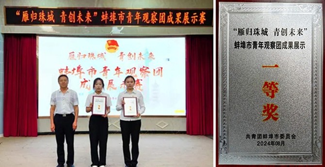 团队在“雁归珠城·青创未来”蚌埠市青年观察团成果展示赛中,以《盛夏“乡”约——看五河县沱湖乡高质量绿色发展新画卷》为题汇报实践成果,荣获蚌埠市一等奖,相关调研成果得到当地政府认可,部分建议纳入沱湖乡乡村振兴规划;团队撰写的调研报告荣获安徽省“百校千镇万村”大学生乡村振兴大调研“优秀调查报告”奖项。