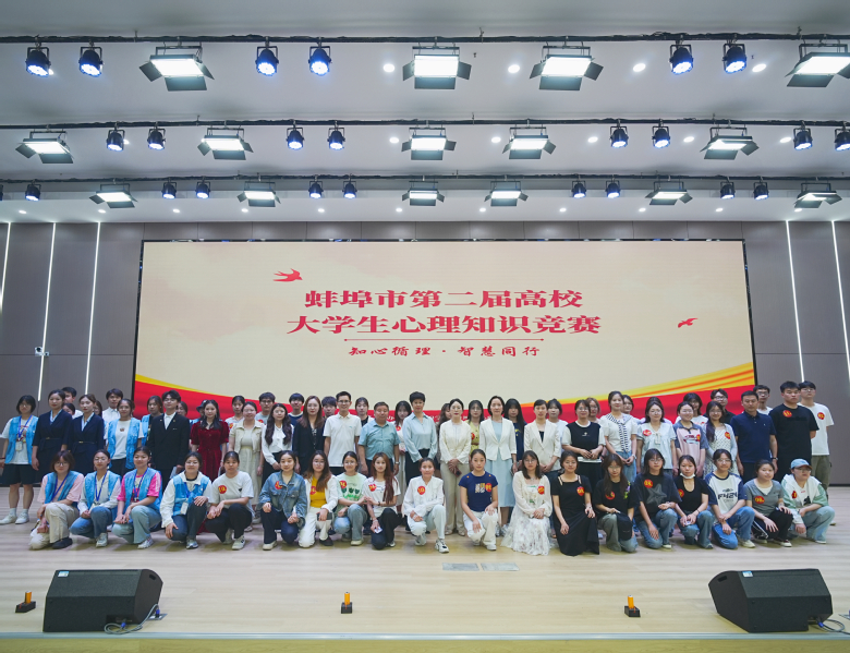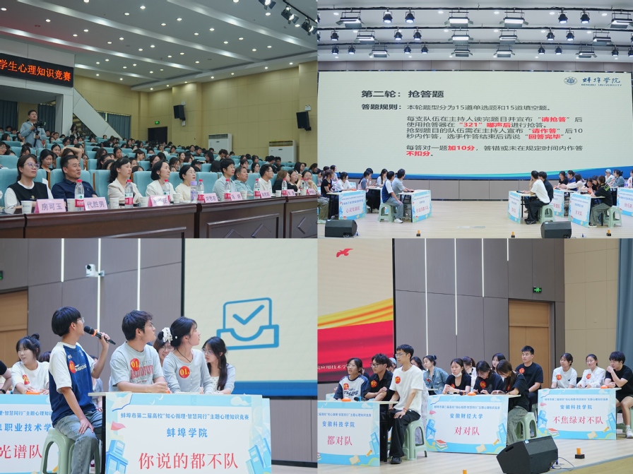 5月28日下午,由蚌埠市心理学会挂靠单位蚌埠学院主办,安徽财经大学、蚌埠医科大学、安徽科技学院等六所高校联合承办的蚌埠市第二届高校大学生心理知识竞赛在蚌埠学院学术报告厅圆满落幕,党委学生工作部主要负责同志以及联办高校心理健康教育相关负责同志出席活动并颁奖,全市高校师生代表及参赛选手现场参与。