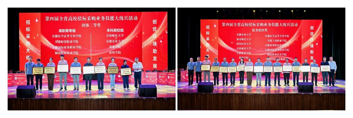 2025年5月29日,第四届全省高校招标采购业务技能大练兵比赛决赛在合肥圆满落幕。我校代表队在比赛中表现优异,荣获优秀组织奖和集体二等奖两项集体荣誉,同时三位参赛教师分获个人三等奖,展现了我校招标采购管理队伍的专业水平和良好风貌。