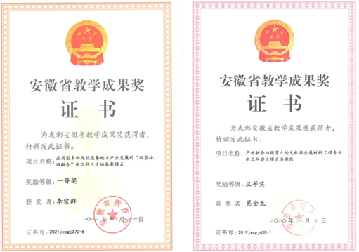 科研成果:获批安徽省科学技术奖三等奖2项,获批非金属矿科学技术奖科技进步奖二等奖1项。教师主持国家自然科学研究基金面上项目1项,青年基金项目2项。主持安徽省自然科学研究基金项目6项,安徽省重点研究与开发计划项目2项,主持产学研项目200余项,横向项目到校经费2500多万元,授权发明专利80余项,发表SCI/EI等高水平论文300余篇,出版学术专著1部,专利或技术成果实现转化50余项。