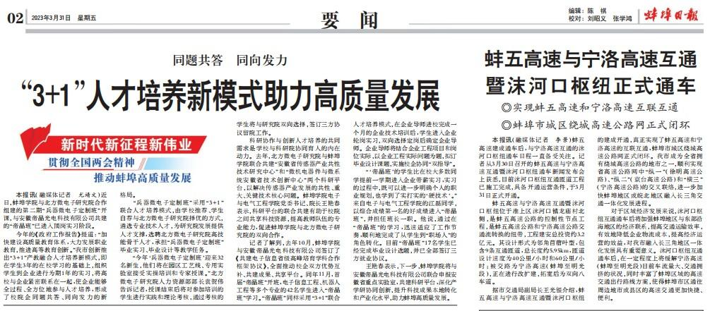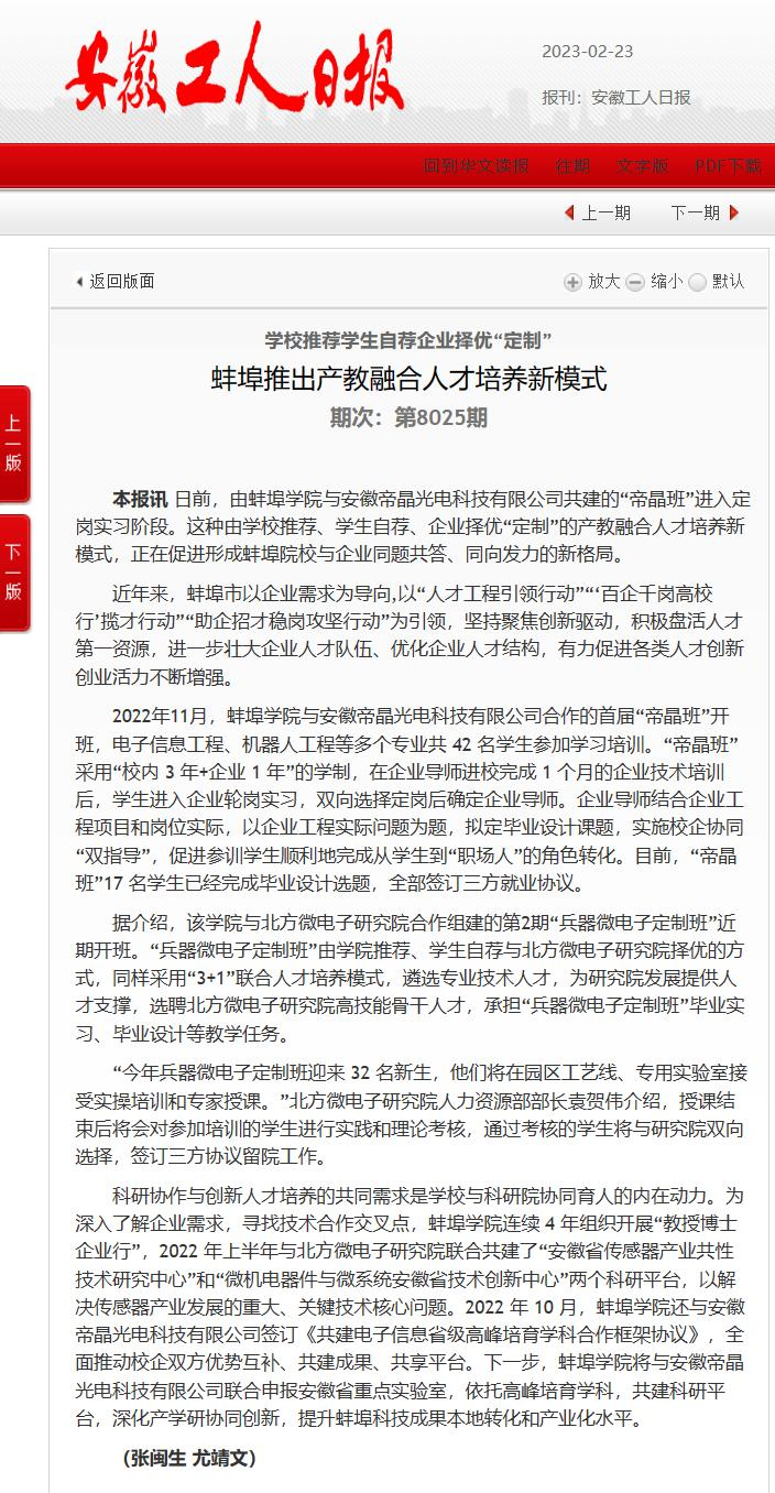 1. 人才培养创新。学院深化“校-企-所”合作,构建“需求对接、资源共享、人才共育”的协同育人机制。积极服务智能传感器、新型显示等地方主导产业集群,与地方龙头企业共建“安徽省智能制造现代产业学院”“安徽省新型显示现代产业学院”,打造“产教融合型”师资队伍,柔性引进中国科学院研究员等高层次人才,聘任行业导师20余人,联合企业开发课程10余门,共建实习实训基地10余个,共同开设“帝晶班”“微电子班”等订单式人才培养班,探索“3+1”产教融合协同育人新模式获《安徽工人日报》《蚌埠日报》专题报道,产教融合经验在全省推广。