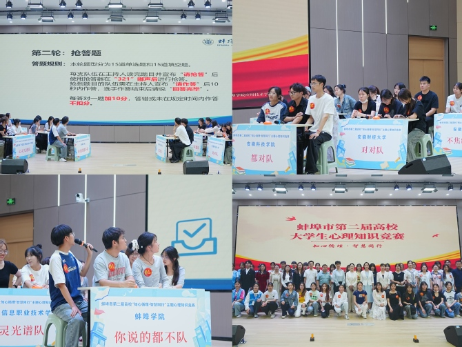我校联合安徽财经大学、蚌埠医科大学、安徽科技学院等蚌埠市内七所高校,依托蚌埠市心理学会,成功主办蚌埠市第二届高校心理健康知识竞赛,吸引了8000余名大学生参与。此外,校内同步举办第十一届大学生心理健康知识竞赛团队赛,78支队伍通过现场抢答、两两PK等形式激励角逐,尽显风采。知识竞赛不仅普及了心理健康知识,提升了大学生心理健康素养,更让同学们在竞技与合作中体验到学习的乐趣,达到了寓教于乐、寓学于趣、寓教于心的良好效果。此外,2025年心理科普作品征集大赛同期举行,进一步拓宽了心理健康知识的传播渠道。