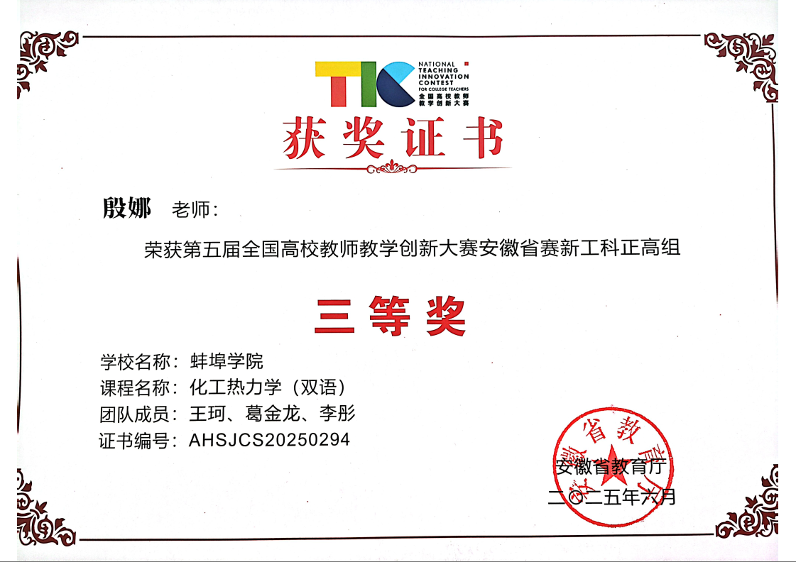近日,第五届全国高校教师教学创新大赛安徽赛区比赛结果揭晓,材料与化学工程学院殷娜教授领衔的教学团队,凭借其精心打造的《化工热力学(双语)》课程,在激烈的竞争中脱颖而出,荣获安徽省新工科正高组三等奖。这一奖项不仅是对殷娜教授团队教学创新能力的认可,更彰显了我校在新工科建设与双语教学融合探索中的显著成效。