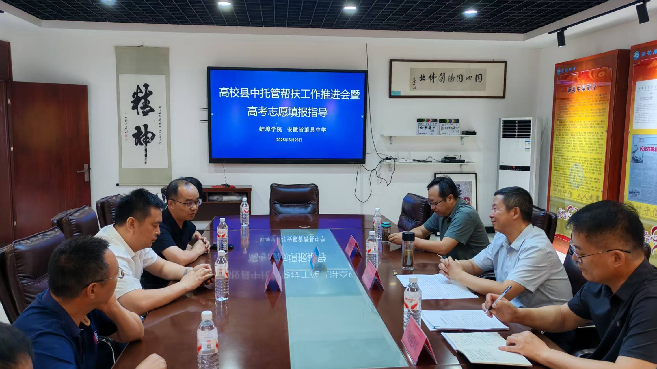 同期召开的高校县中托管帮扶工作推进会聚焦深化高校与县中教育协同发展,致力于拓宽高校人才选拔渠道,打破学段壁垒,实现高中特色与大学专业的无缝对接。会议期间,双方就高中教师职后培训、高中生参与科研实验、学科竞赛等方面进行了深入探讨与交流。蚌埠学院充分发挥学科优势与专业特色,为学生详细解读招生政策,剖析专业内涵及就业前景,并提供个性化志愿填报建议,助力考生精准规划未来。