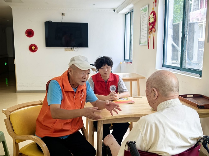 午后的敬老院里,阳光透过窗棂洒在老人们的笑脸上。活动开始,经过培训的大学生志愿者们很快与老人们熟络起来,一对一的陪伴让每个角落都充满温情。在敬老院的一个个小房间里开启了温馨时光。有的志愿者搬来小板凳坐在老人身边,轻声问道:“爷爷,您年轻的时候最喜欢听什么歌呀?”话音刚落,便拉起老人的手唱起了《东方红》《歌唱祖国》等经典红歌。熟悉的旋律像一把钥匙,打开了老人们的记忆闸门,拉着志愿者的手,谈起年轻时的故事,眼里的光让人难忘。有的志愿者则化身“倾听者”,耐心听老人讲述过去的故事——从年轻时在田间劳作的场景,到参与家乡建设的点点滴滴,志愿者们时而点头回应,时而追问细节,“奶奶,您那时候种的水稻一亩能收多少呀?”简单的互动让老人感受到被重视的温暖。