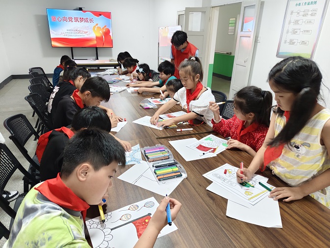 随后,村委会的老师们与大学生志愿者一同带领孩子们开展“红色绘画”涂色游戏。志愿者分发给孩子们空白涂色画,并拿出画笔让小朋友们自由发挥创作,上面有党徽、天安门、五星红旗等等,孩子们纷纷拿起画笔涂色,红红的、亮亮的、暖暖的、五颜六色的。最后孩子们举着自己的画作,和志愿者、老师们合影,稚嫩的笑脸与鲜艳的红色画作相映,定格成一幅“童心向党”的温暖画面。“这样的活动既让孩子们学到了知识,又拉近了大家的心。”东风村也表示,大学生志愿者的到来为村里注入了青春活力,而红色主题的互动与创作,更让孩子们在实践中厚植了爱国爱党情怀。