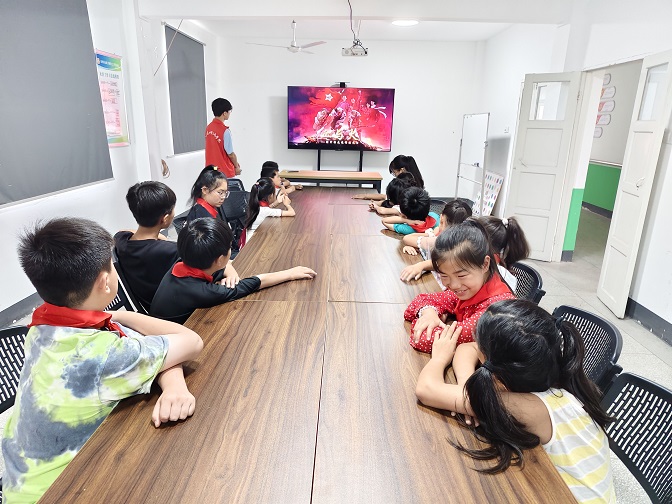 6月26日,实践团队走进东风村,活动伊始,志愿者们借助精心制作的PPT,为孩子们打开了党史学习教育的大门。一张张泛黄的老照片、一段段精简的文字,搭配志愿者们通俗的讲解,将五四运动“红军长征”“开国大典”等重要历史节点娓娓道来。讲解结束后,志愿者们以“一对一”“小组式”的互动方式深化学习效果。有的志愿者带着孩子们朗读红色童谣,用节奏传递爱国情感;有的拿出提前准备的“党史小卡片”,和孩子们玩起“你划我猜”——“这个英雄在抗美援朝战场上用身体堵住枪眼”,志愿者做出“堵”的动作,孩子们立刻齐声喊出“黄继光”。全员互动的氛围里,孩子们的好奇心被点燃,红色故事在一问一答中愈发鲜活。