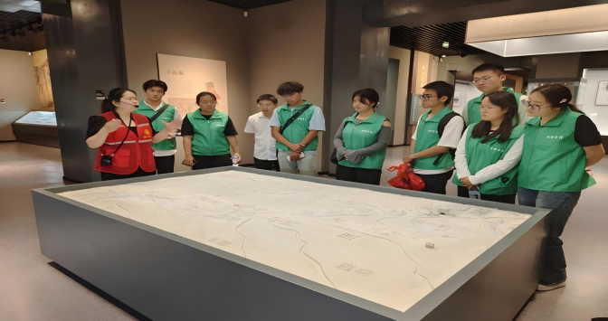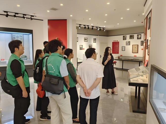 在五河县博物馆,讲解员带领同学们见证了从新石器时代跨越到现当代的陶器﹑铜剑﹑明清民俗等珍贵物件,一件件展品静静诉说着五河悠久的历史和文化。同学们驻足凝视,仔细聆听讲解,在跨越时空的对话中,对脚下这片土地的文化积淀,历史底蕴和独特风貌有了更深的理解与认同,自豪感油然而生。在离开博物馆前,指导老师与团队负责人就博物馆的现阶段的建设成就,五河的历史脉络以及未来发展方向,同博物馆馆长进行了深入交流。