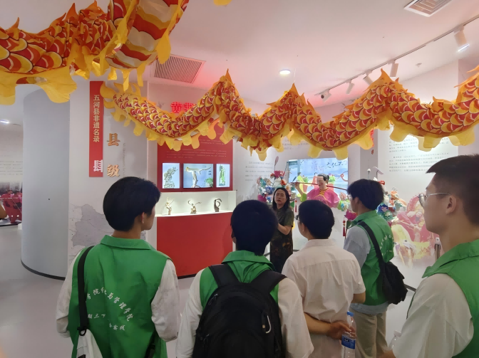 步入五河县文化馆,馆长热情的接待了团队,并亲自担负讲解员的职责,在馆长声情并茂的讲解下,同学们立刻被浓郁的地方文化氛围包围。五河民歌﹑打铁舞﹑临北狮子舞﹑临北毽球等非遗项目展示,吸引了同学们的目光,馆长热情地与同学们交流,分享着传承与保护的故事。近距离的接触让大家真切感受到非遗的魅力,也点燃了他们关注、支持传统文化传承的热情。