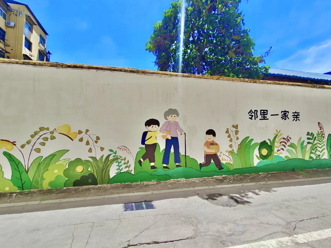 接到海航社区的合作邀约后,艺术设计学院迅速组建15名大学生志愿者团队。结合社区“幸福圆桌会”上居民对“有温度的装饰”的期待,团队以“邻里和谐”为核心,将抽象的理念转化为具象的画面:扎红领巾的孩童搀扶老人、青年志愿者清理楼道、卡通形象讲解垃圾分类……一幅幅贴近生活的场景,搭配“邻里一家亲”等暖心标语,让“和谐邻里”变得可看可感。