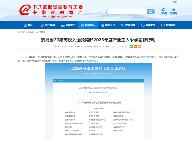 近日,教育部公布2025年度产业工人求学圆梦行动参与高校名单。全国共遴选289家高校,我校成功入选,充分体现了我校在国家政策引领下,推进产业工人队伍建设的强担当和硬实力。此次行动是贯彻落实《教育强国建设规划纲要(2024-2035年)》《中华全国总工会 教育部 人力资源社会保障部 中华全国工商业联合会关于广泛开展实施求学圆梦行动 推进产业工人学历与能力提升的意见》的重要举措,未来将为安徽省产业转型升级和经济高质量发展注入强大动力。