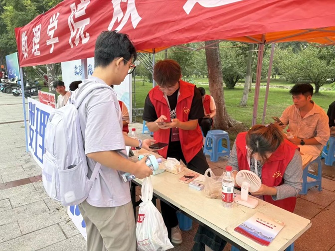 校园内的“迎新大道”上,数理学院的迎新点格外醒目。橙色帐篷下,“数理学院”标识清晰可见,志愿者们井然有序地为新生办理入学手续,核对信息、发放资料,整个流程高效顺畅。迎新现场还贴心准备了矿泉水、休息区等物品,为新生和家长缓解旅途疲惫。