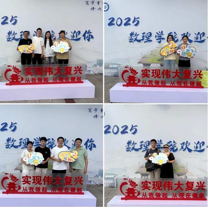 为帮助新生留下难忘的入学记忆,学院特别设立了拍照打卡点。背景板上“数理学院欢迎你”的字样格外醒目,新生与家长手持“新生报到”“放飞梦想”等手牌,在“实现伟大复兴 从我做起 从现在做起”的标语前合影留念,记录下踏入大学校园的重要时刻,脸上洋溢着对未来的憧憬与期待。