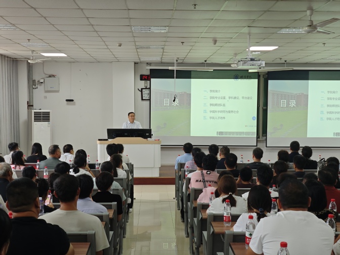 葛金龙简单介绍了学院历史沿革、教学培养理念、师资力量、学科布局与专业建设等情况,重点展示了近年来学院在教科研领域取得的标志性成果、人才培养质量与毕业生发展情况,多维度展现学院的办学实力与发展前景。