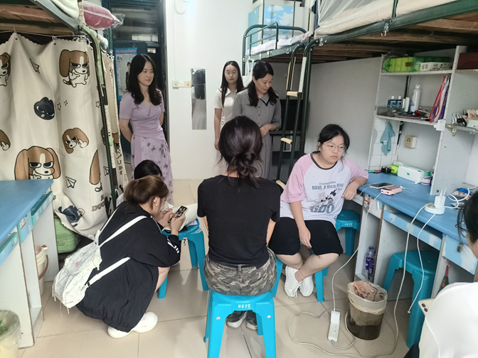 “家乡是哪里?”“报到顺利吗?”“食堂饭菜合不合口味?”每走进一间宿舍,学院领导都会俯身与新生拉家常,细致询问他们对校园生活的初体验,耐心倾听他们的憧憬与困惑,并现场答疑解惑。黄迎辉勉励大家:“大学是人生的新赛道,希望同学们尽快完成角色转换,把宿舍当成第一个‘小家’,把学院当成第二个‘大家’,在这里找到方向、学会独立、收获成长。”新生辅导员也趁此机会与学生进行亲切交谈,重点叮嘱新生提高警惕,保管好个人财物,对任何形式的上门推销勇敢说“不”。很多同学惊喜地说:“还没正式上课,老师就上门‘家访’,这样的大学太暖了!”