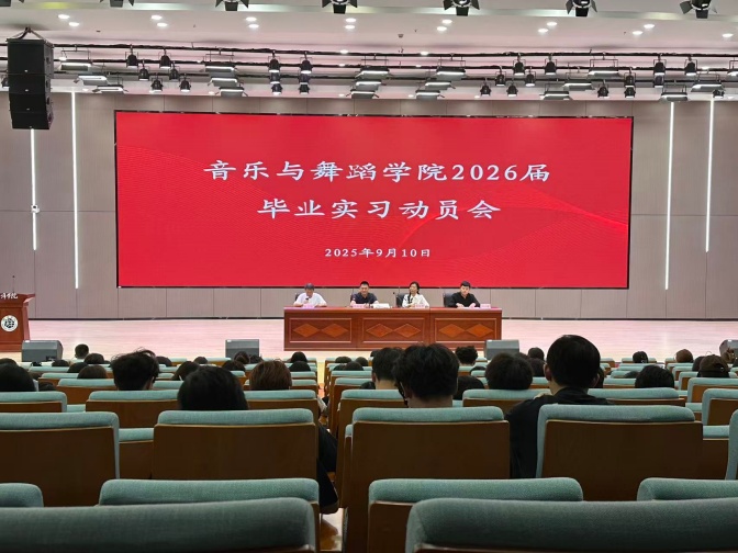 9月10日,音乐与舞蹈学院2026届毕业生实习动员大会在学术报告厅隆重举行,音乐与舞蹈学院院长张永芳,党委副书记、纪委书记张怀敏,音乐学专业负责人佐志刚,实习工作指导小组全体教师及2026届实习生参加会议。