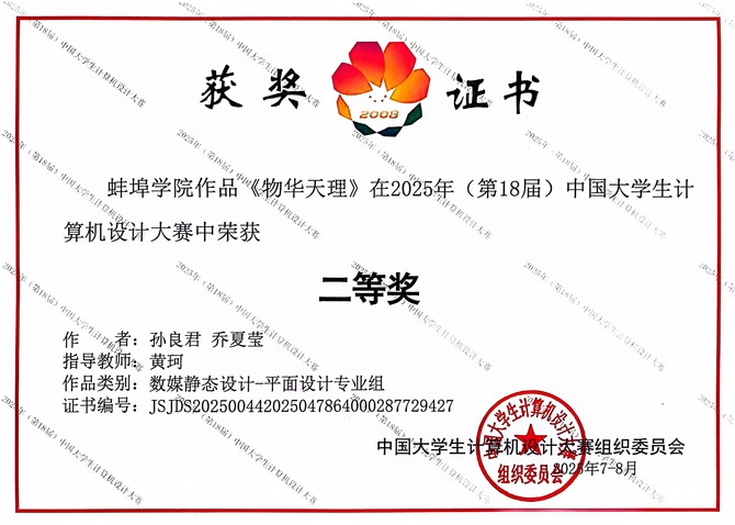 近日,第18届“中国大学生计算机设计大赛”全国总决赛在南京大学落下帷幕。经过激烈角逐,艺术设计学院院数字媒体专业孙良君、乔夏莹同学凭借其参赛作品《物华天理》(指导老师:黄珂)出色的创意设计与技术应用,喜获全国总决赛二等奖。