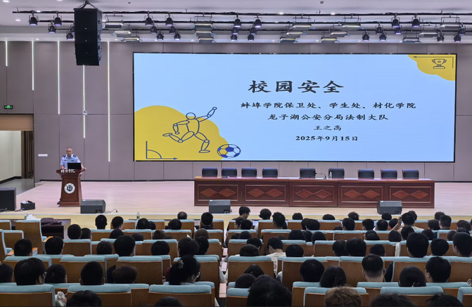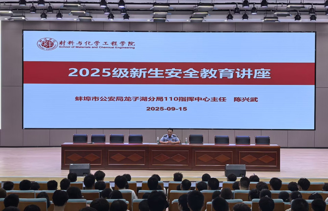 为增强2025级新生的安全意识,全面提升新同学的安全防范技能,9月15日晚,材料与化学工程学院在学术报告厅成功举办了2025级新生安全教育专题讲座。讲座特邀蚌埠市公安局龙子湖分局指挥中心主任陈兴武、龙子湖分局法制大队王之高警官作为主讲,学院党委书记张敏、党委副书记朱银邦、新生辅导员及2025级新生参加。