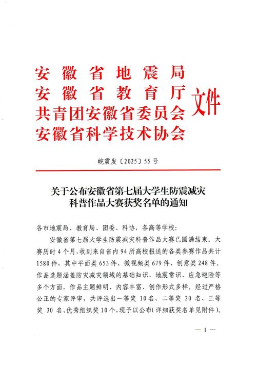 安徽省大学生防震减灾科普作品大赛是安徽省地震局、安徽省教育厅联合主办的省级重要赛事之一,旨在搭建大学生防震减灾科普创作与交流的平台,鼓励青年学子将专业知识与社会需求相结合,创编更生动、易懂的防震减灾知识传播形式,切实提升全民防灾减灾意识与应急避险能力。第七届大赛自启动以来,吸引了全省近百所高校的数千名学生参与,参赛作品涵盖短视频、漫画、科普文章、互动H5 等多个类别,经过专家评审团对作品科学性、创新性、传播性的多维度严格筛选,最终确定各奖项归属,我校学子的获奖充分体现了作品的高质量与竞争力。