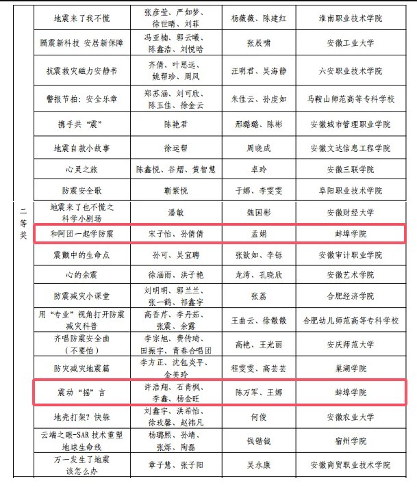 近日,安徽省第七届大学生防震减灾科普作品大赛获奖名单正式公布,我校学子凭借扎实的专业知识与创新的科普思维脱颖而出——来自艺术设计学院的宋子怡与孙倩倩同学共同创作的作品《和阿团一起学防震》(指导教师:孟娟),来自音乐与舞蹈学院的许浩翔、石青枫、李鑫及杨金旺同学共同创作的作品《震动“摇”言》(指导教师:陈万军、王娜),在全省众多高校的参赛作品中脱颖而出,最终斩获2项省级二等奖的优异成绩,为学校赢得了荣誉。