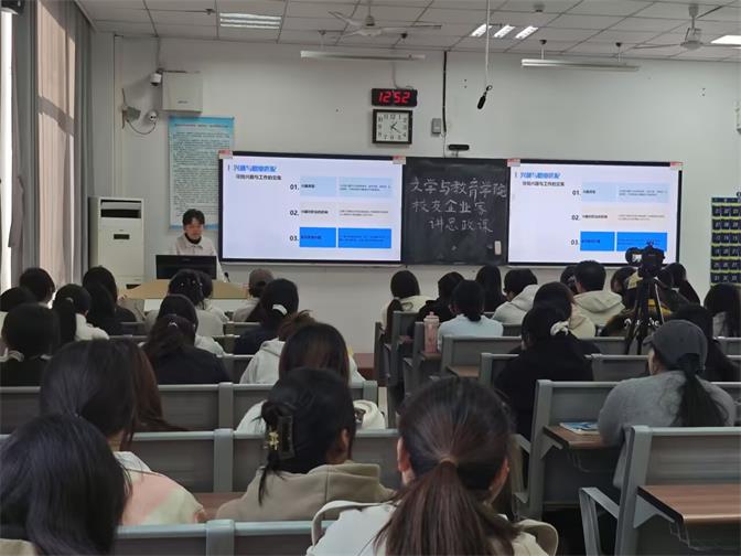 为深入推进“大思政课”建设,发挥杰出校友榜样作用,扎实推进实践育人,10月23日,文学与教育学院邀请2018届学前教育专业毕业生、安徽禹翼航空科技有限公司总经理胡凯来校开展校友企业家讲思政课活动。学院党委副书记蒋晟、校友联络人林婷婷以及学生代表近百人参加活动,活动由蒋晟主持。
