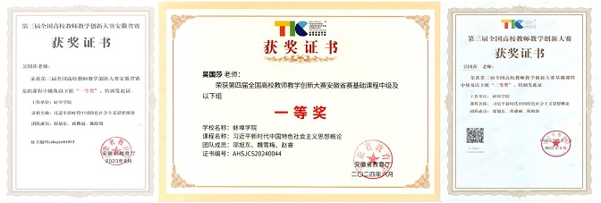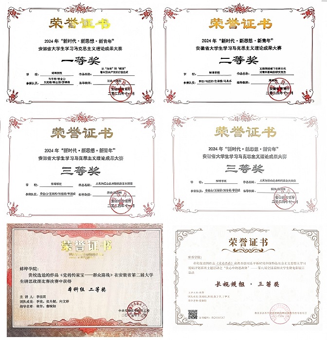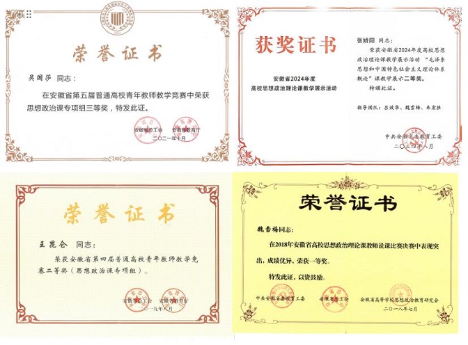 育人成效突出:学生在思政相关竞赛中成绩优异,获安徽省大学生学习马克思主义理论成果大赛一等奖1项、二等奖2项、三等奖12项,安徽省大学生讲思政课比赛二等奖1项,第八届全国高校大学生微电影展示活动全国三等奖1项,实现理论教学与实践育人的有机统一。