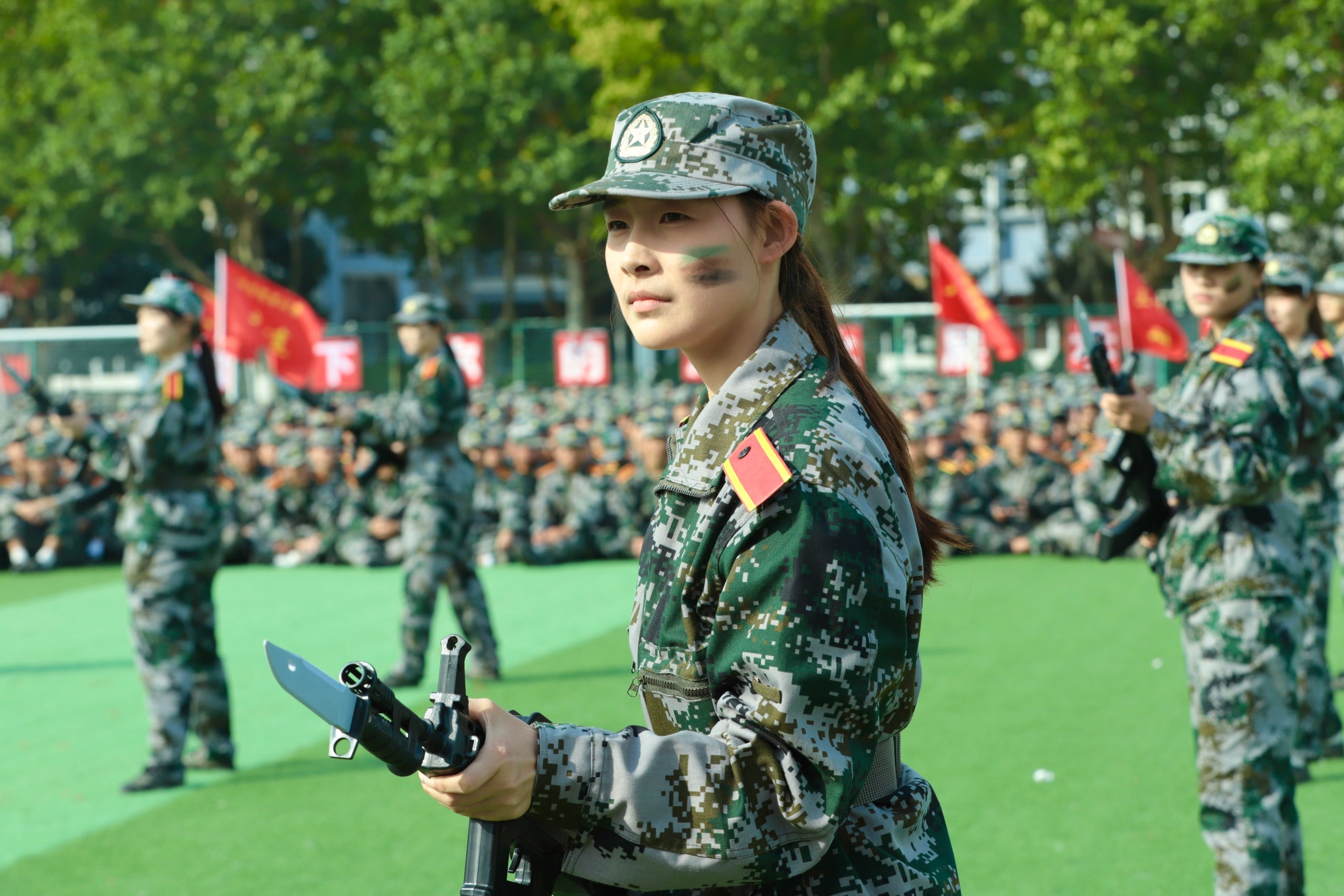 女子方阵带来的枪刺训练展示动作整齐、英姿飒爽。阳光下,她们目光坚毅、身姿挺拔,既有巾帼不让须眉的飒爽英姿,又展现出新时代女大学生的自信与力量。