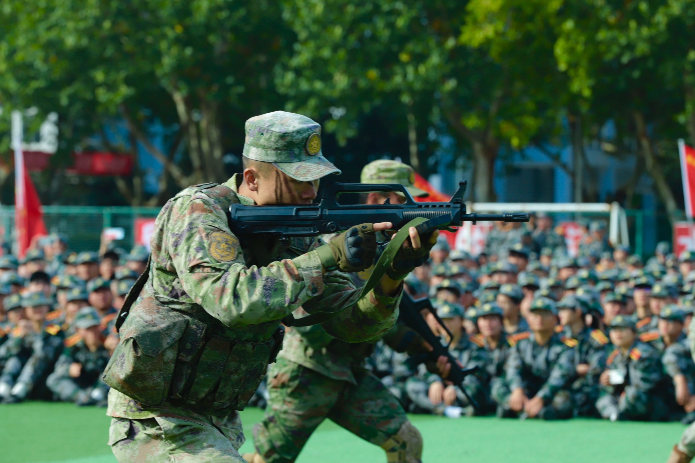 军事科目演示环节中,教官方队展示了标准的枪刺动作,并带来了精彩纷呈的实战化军事演练。在模拟战场环境下,教官们展示了侦察渗透、战术协同、突击攻坚等实战技能,其精湛的军事素养和英勇的战斗作风,让现场师生深切感受到新时代军人的使命担当。