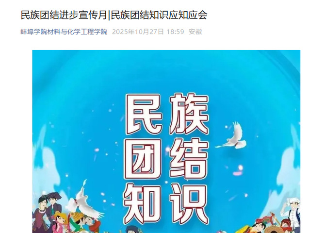 为了扩大民族团结进步教育的覆盖面,学院充分利用微信公众号等新媒体平台,推送习近平总书记关于民族团结的重要论述、民族团结知识等相关内容,让广大师生更加便捷地了解民族团结相关知识,营造了全员参与、共同学习的良好氛围,进一步增强学院师生维护民族团结、促进社会和谐的责任感和使命感。