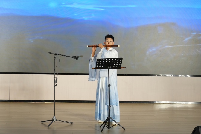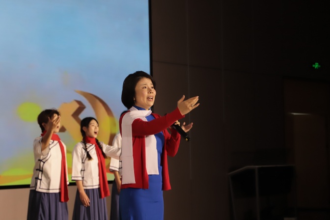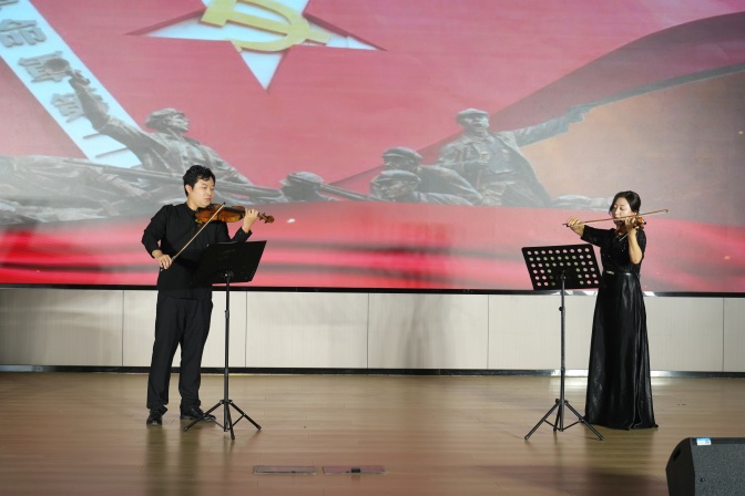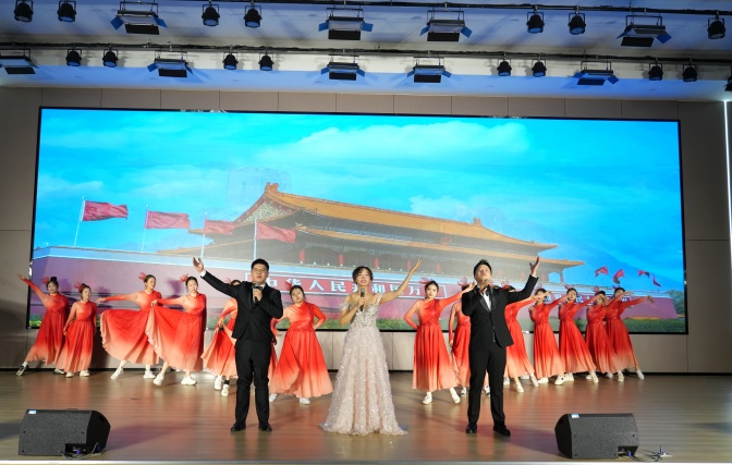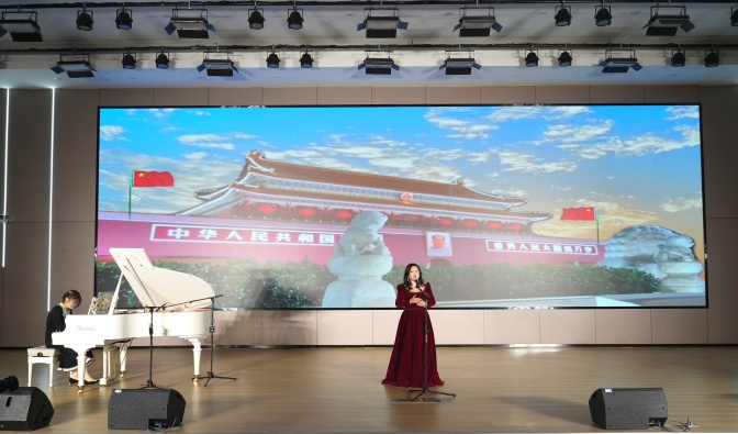 第四篇章“领航未来·同心向党”用歌声奏响奋进强音。进入新时代,旋律中饱含着复兴路上的奋进凯歌、人民赞歌与时代壮歌。孙辰、陈岸清、陈轶铭老师演唱歌曲《不忘初心》,这不仅是一句庄严誓词,更是一种持久的精神力量;高一寒、牛衍敏老师小提琴重奏《万疆》描绘出伟大祖国在新时代山河无恙、国泰民安的壮美画卷;郭静雯等老师齐声合唱《我爱你中国》《把一切献给党》,歌声中饱含着把个人理想融入时代洪流,将青春热血献给党和祖国的饱满热情。