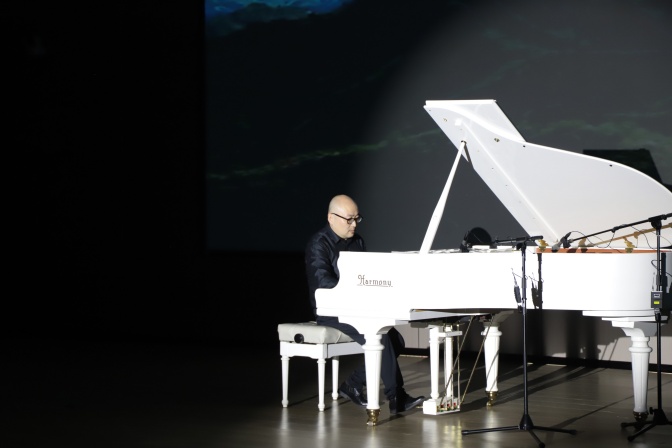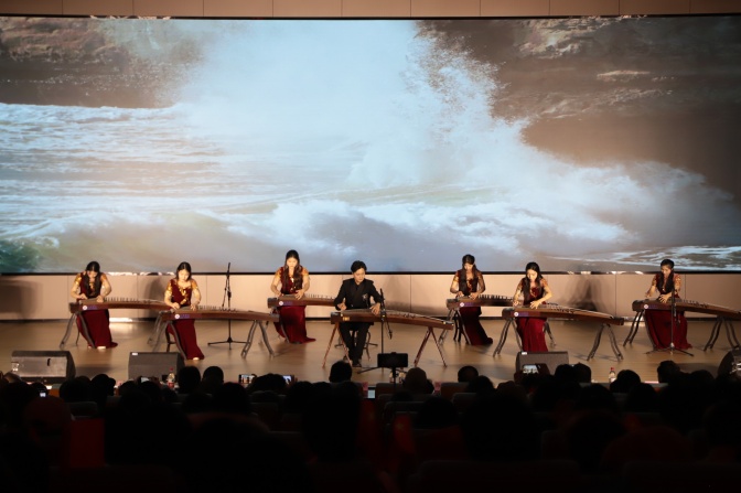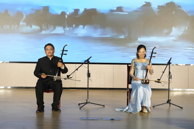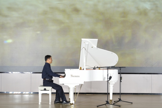 第二篇章“建设征程·时代心声”,用音符定格发展足迹。芦宇老师钢琴独奏《在希望的田野上》描绘了广袤田野上人民群众辛勤劳作、憧憬美好生活的动人画面;丁瑞鸿老师竹笛独奏《沂河欢歌》描绘了沂河两岸秀美的自然风光和群众昂扬乐观的精神面貌;曹晓亮老师古筝合奏《战台风》展现了不畏艰险、迎难而上的精神气质;王敬、李浩然老师二胡合奏《赛马》展现出蓬勃生机与豪迈气度;郭千老师钢琴独奏《走进新时代》表达了人民群众满怀信心迈向新时代的坚定步伐与美好期待。