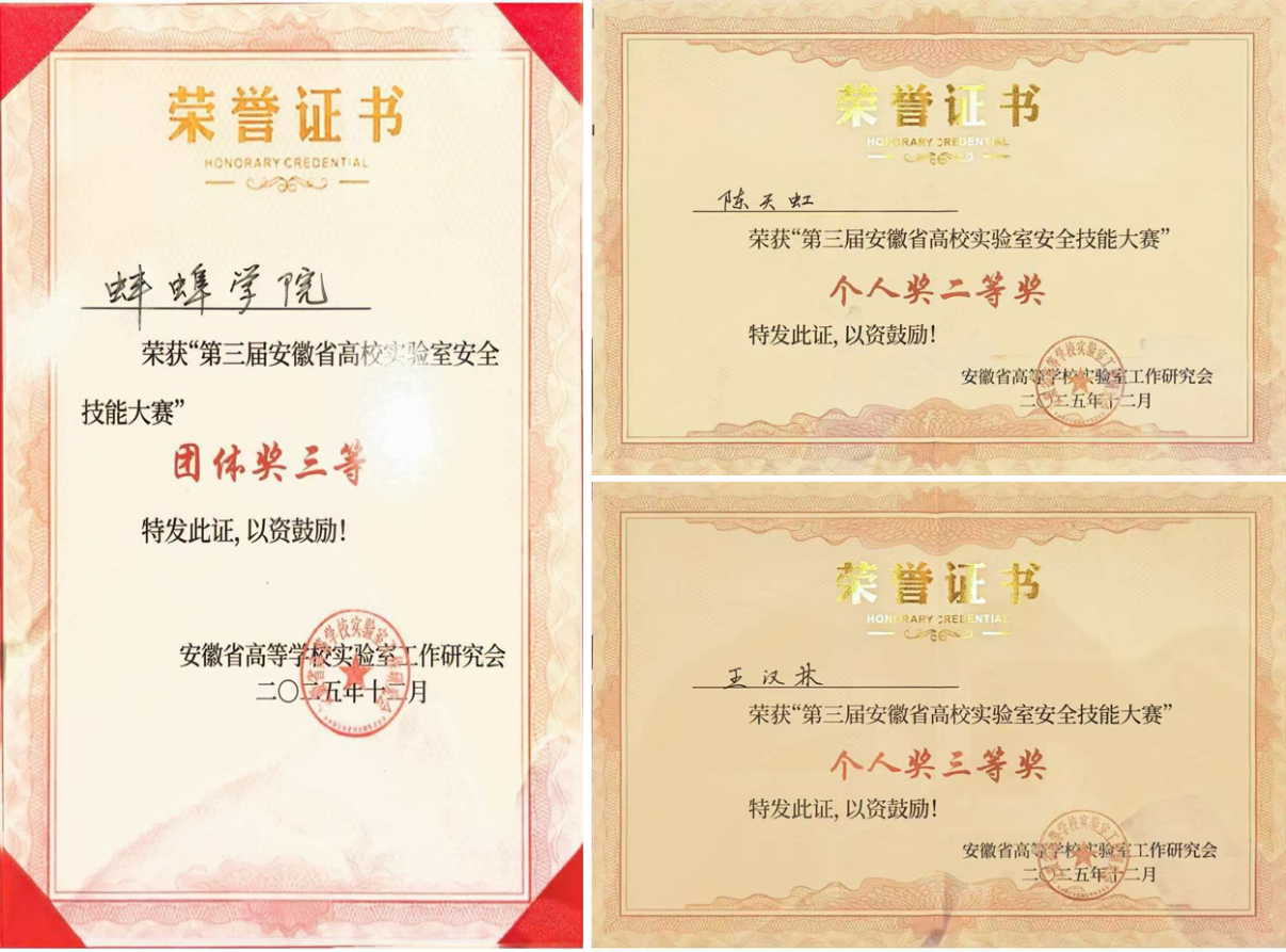 竞赛中,我校代表队沉着应战:理论考核环节,队员们精准作答、高效完成限时答题任务;实操考核环节,大家规范操作、默契配合,准确排查安全隐患并提出科学整改方案。最终,我校代表队荣获团体三等奖,队员陈天虹老师凭借优异表现斩获个人二等奖、王汉林老师获评个人三等奖,充分彰显了我校教师扎实的实验室安全管理功底与过硬的实践操作能力。